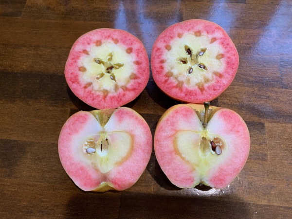 飯綱町の隣、中野市の篤農家 吉家一雄さんが育種した赤果肉リンゴの一品種。何種類もある赤果肉リンゴのうち、蜜が入り味も良い品種が【ムーンルージュ】です。